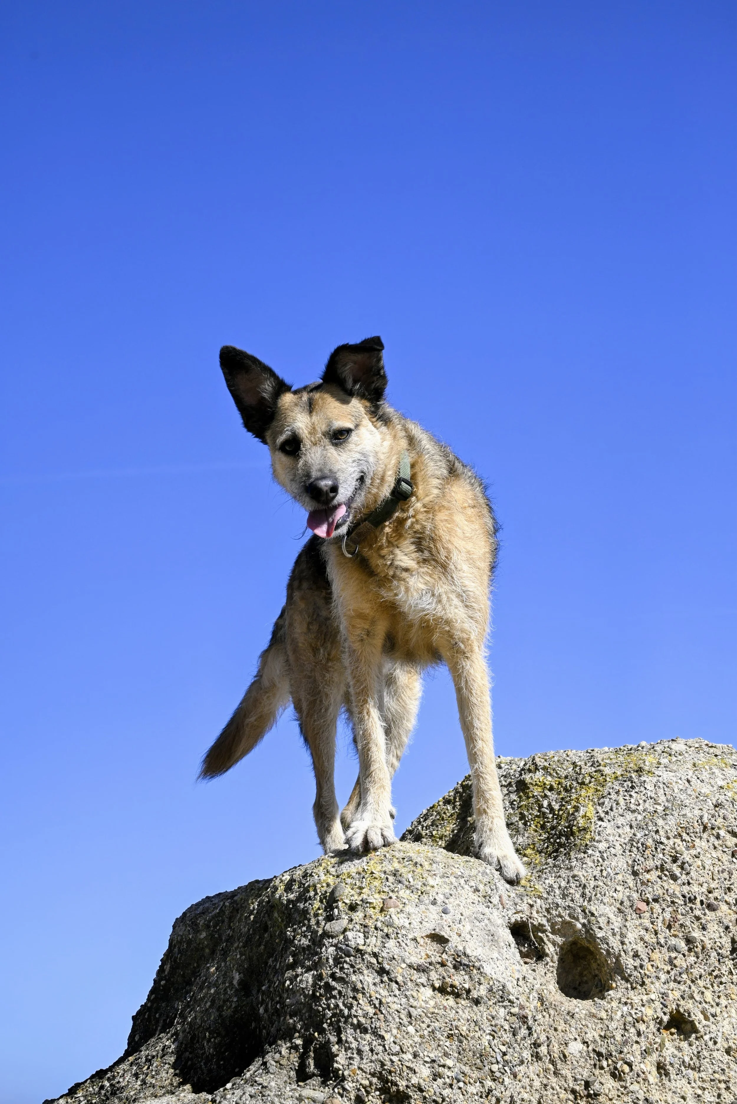 Flint - Ex-reactive Romanian rescue. He is a mix of lots of hound breeds with some shepherd, chihuahua and various other random breeds mixed in. I initially worked with a balanced trainer which just made his reactivity worse. Using more empathetic methods, prioritising behaviour over obedience, he has now become much more sociable and is able to make the right choices. He can still lean into his protector role on our pack walks as this is something he enjoys, but is able to do this in a stable and calm manner while still being engaged and listening to instruction from me. He is now so much happier in himself and his fun loving nature has come much more to the front now he isn't stressed. In his work role, he is the stooge I use to help me read other dogs intentions and he assists me teaching dogs appropriate social behaviour.
