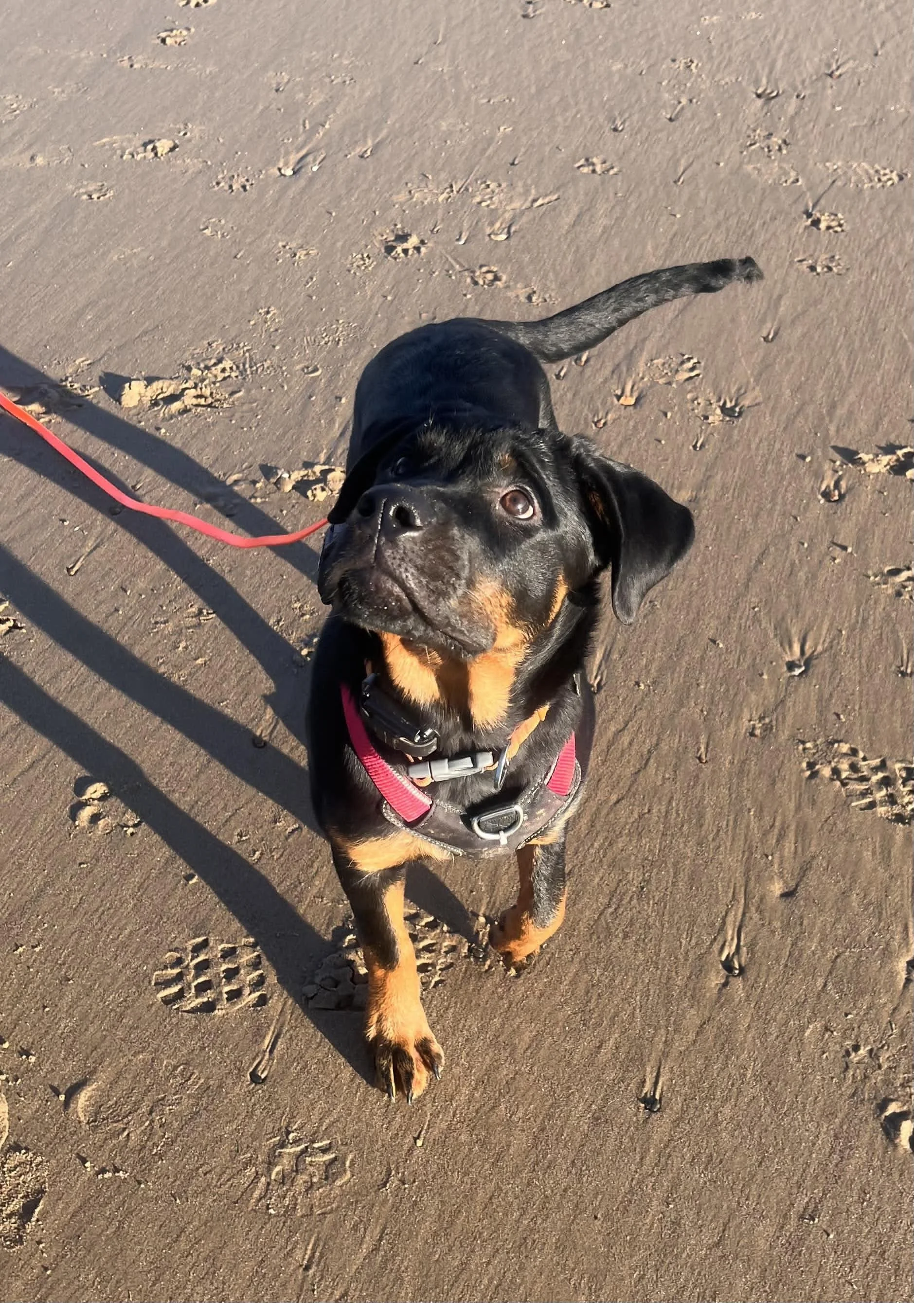 Ember - Rottweiler. She has always been raised in line with the empathetic and relationship based training methods used on Honest Hounds and is an absolutely delightful dog. She has never shown any issues with people or other dogs and generally is fun loving, easy going and chilled. On our pack walks, she is curious and anticipatory about meeting new dogs and people. In her work role, she takes on the opposing role to flint, being the fun and goofy dog to help dogs come out of their shells and realise not all dogs are a potential threat.
