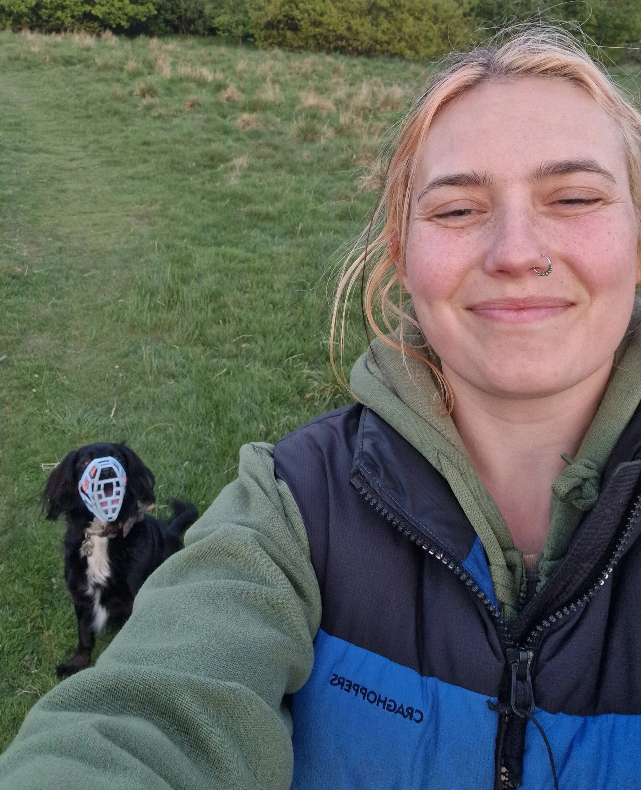 My dog is Max, a 7yo spaniel who has a short fuse in proximity/face-face with dogs and guarding around dogs. He wears a muzzle around dogs and we're happy to do on or off lead walks of any distance ⛰️🐾”